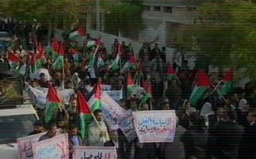Protestas en la franja de Gaza contra la presencia de George Bushe en los territorios palestinos. (Imagen de la televisión)