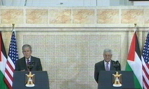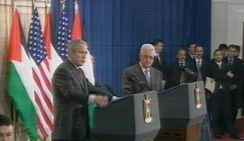 George Bush y Abú Mazen ofrecen una conferencia de prensa en la Mukata de Ramala, sede del Gobierno de la ANP. (Imagen de la televisión).