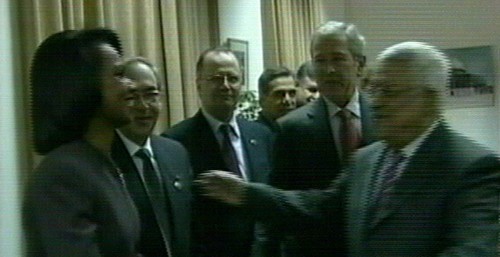 Abú Mazen saluda en la Mukata a la secretaria de Estado de EEUU, Condoleezza Rice. (Imagen de la televisión)