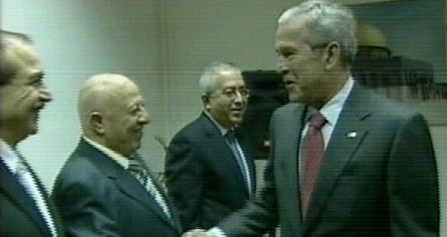 Bush saluda a los miembros de la ANP antes de la reunión con Abú Mazen en la Mukata de Ramala. (Imagen de la televisión)