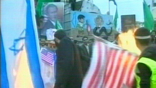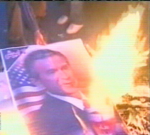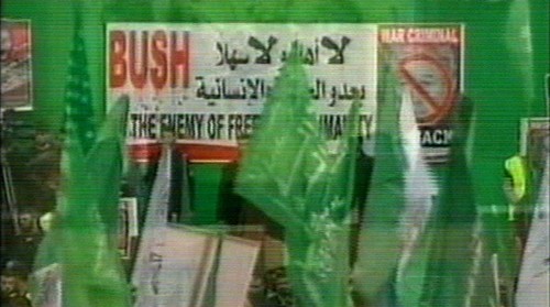 Fotos del presidente George Bush y banderas de EEUU fueron quemadas en las calles de la ciudad de Gaza. (Imagen de la televisión)
