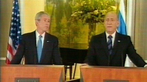Ehud Olmert y George Bush durante la conferencia de prensa conjunta. (Imagen de la televisión)