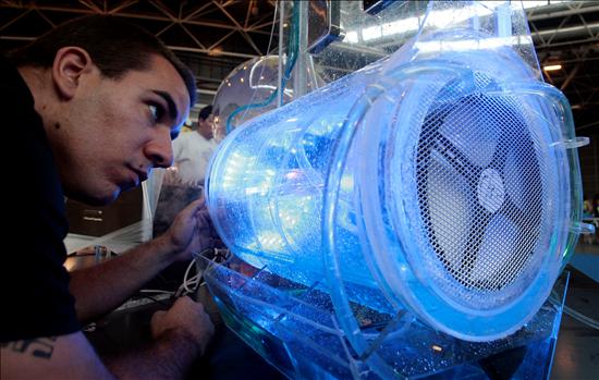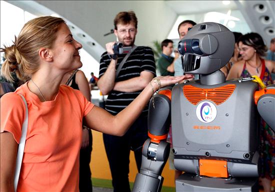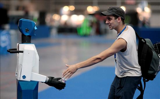 Un joven saluda a un robot a su llegada a la duodécima Campus Party el lunes 28 de julio. El encuentro finalizará el domingo 3 de agosto. (EFE)