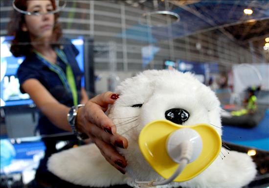 Una joven interactua con el primer robot terapéutico disponible en España. El invento, de origen japonés, está caracterizado como un peluche y se dirige a pacientes con autismo, demencia senil y Alzheimer. Su interior está repleto de sensores, dos minicámaras y siete motores, que le hacen sensible a la luz, a la voz y al tacto. (EFE)