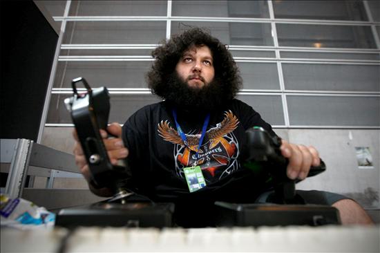 Salvador Blasco, de 31 años, disfruta de un videojuego durante la duodécima Campus Party que se celebra estos días en Valencia. Blasco asiste desde 2005 de este encuentro de ocio electrónico, tecnología y cultura digital. Este año están triunfando los videojuegos musicales. (EFE)