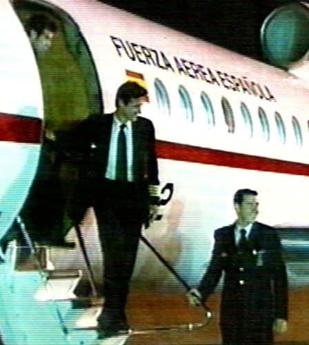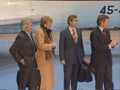 Los tres pilotos liberados el viernes en Chad junto a las azafatas liberadas por Sarkozy en la base aérea de Torrejón de Ardoz. (LDTV)
