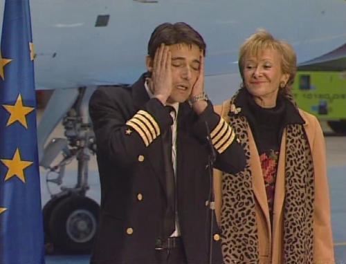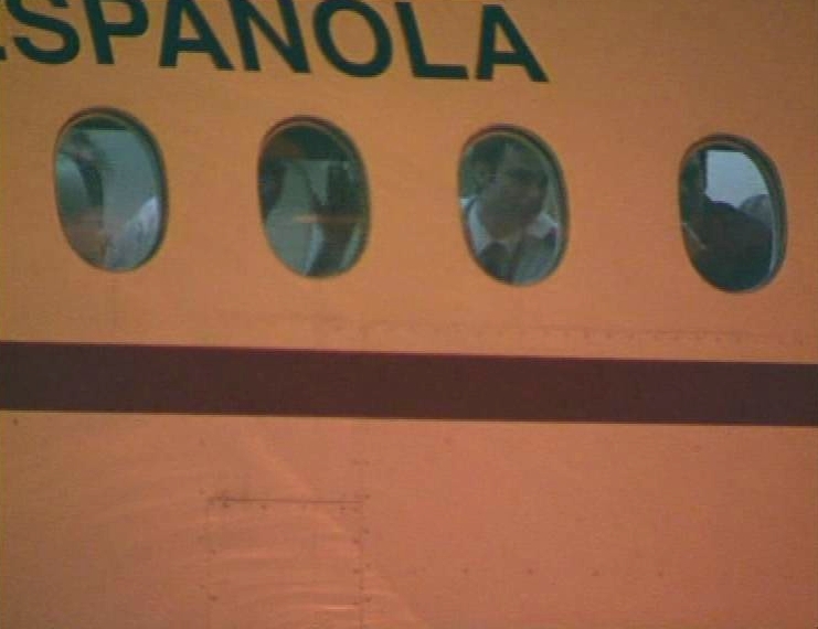 El copiloto Sergio Muñoz, el piloto Agustín Rey y el auxiliar de vuelo Daniel Gozález, saludan desde la ventanilla de la avión segundos después de aterrizar en Torrejón de Ardoz.(LDTV)