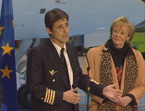 El Secretario de Estado de Asuntos Exteriores, Bernardino León se colocó junto a los tres pilotos en la pequeña rueda de prensa improvisada que celebraron tras conocer su liberación. (LDTV)