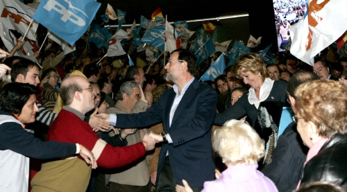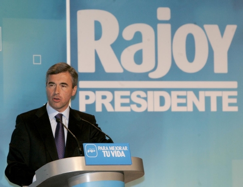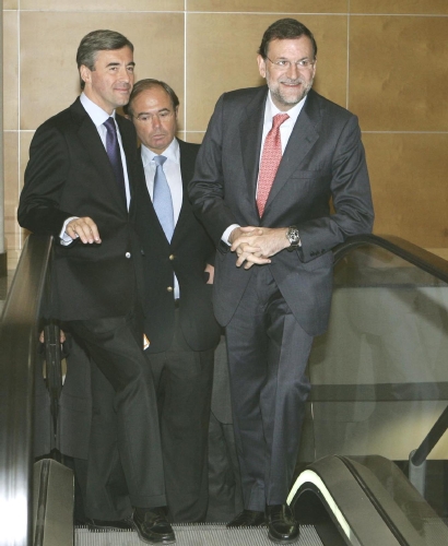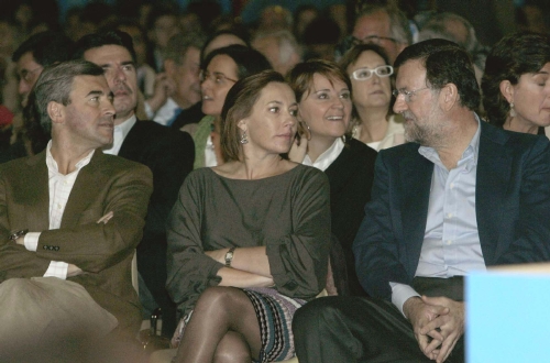 Rajoy acusó al Gobierno de poner la política exterior al servicio de un partido cuando debe ser la que "corresponde a la dignidad" de España. "No es razonable que nos alineemos con tiranos frente a los disidentes tanto en Cuba como en Venezuela", proclamó mientras un grupo de venezolanos reclamaba libertad para su país. En la imagen, Ángel Acebes (i), la esposa de Rajoy, Elvira Rodríguez, (c) y Mariano Rajoy (d). (LD)