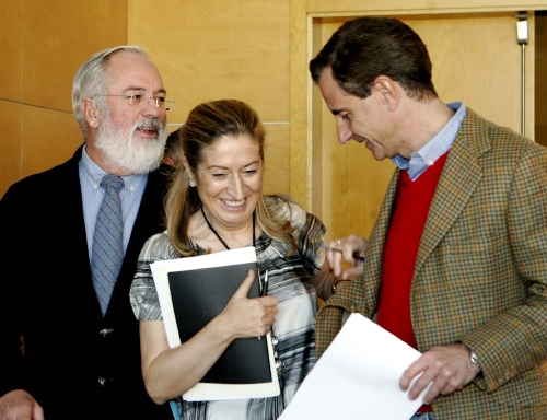 Miguel Arias Cañete (i), Ana Pastor (c) y Juan Costa (d), a la salida de una reunión de trabajo. (LD)