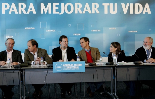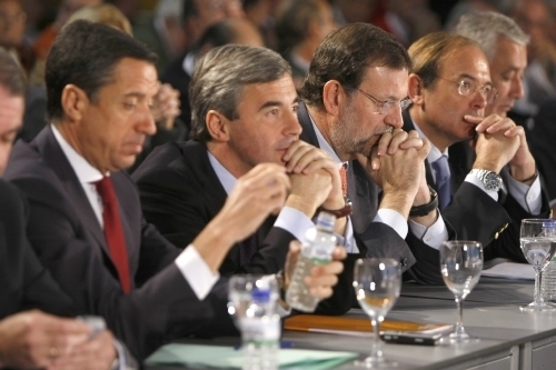 El presidente del PP, Mariano Rajoy (c), junto a los dirigentes de su partido Eduardo Zaplana, Ángel Acebes, Pío García Escudero y Javier Arenas, al inicio de la primera jornada. (EFE)