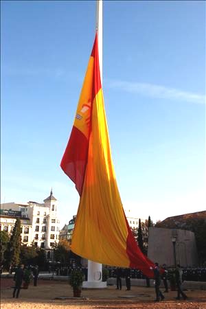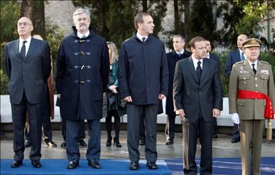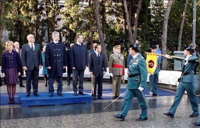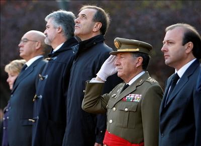 La presidenta de la Comunidad de Madrid, Esperanza Aguirre, los presidentes del Senado y Congreso, Javier Rojo y Manuel Marín, respectivamente; el ministro de Defensa, José Antonio Alonso, y del Jefe del Estado Mayor de la Defensa (JEMAD), general Félix Sanz Roldán, el director general de la Policía y la Guardia Civil, Joan Mesquida (i a d), durante la ceremonia de izada de la bandera en la Plaza de Colón. (EFE)