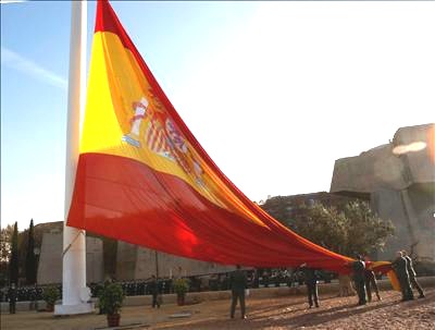 Miembros de la Guardia Civil fueron los encargados de izar la bandera en la Plaza Colón. (EFE)