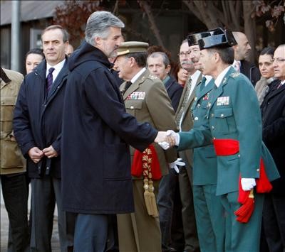 El presidente del Congreso, Manuel Marín, saluda a representantes de la Guardia Civil en presencia del ministro de Defensa, José Antonio Alonso y del Jefe del Estado Mayor de la Defensa (JEMAD), general Félix Sanz Roldán. (EFE)