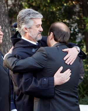 El presidente del Congreso, Manuel Marín (i), abraza al director general de la Policía y la Guardia Civil, Joan Mesquida. (EFE)