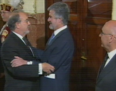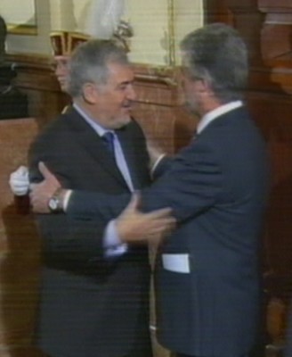 Manuel Marín recibe al ministro de Economía, Pedro Solbes. (Imagen TV)