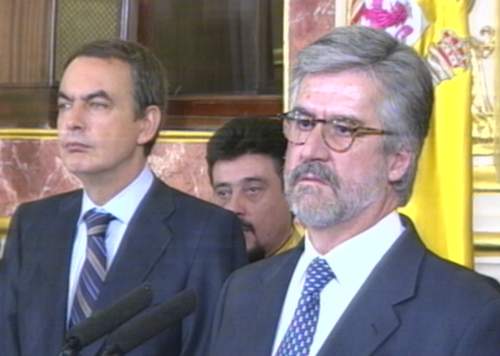 De izquierda a derecha: Javier Rojo, Eduardo Zaplana, Manuel Marín, Mariano Rajoy, Carmen Calvo y López Aguilar. (Imagen TV)