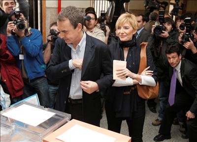 El presidente del Gobierno, José Luis Rodríguez Zapatero (i), junto a su esposa Sonsoles Espinosa (d), votaron en el Colegio Nuestra Señora del Buen Consejo (Madrid). A la salida, llamó a la participación porque votar "nos hace más libres". (EFE)
