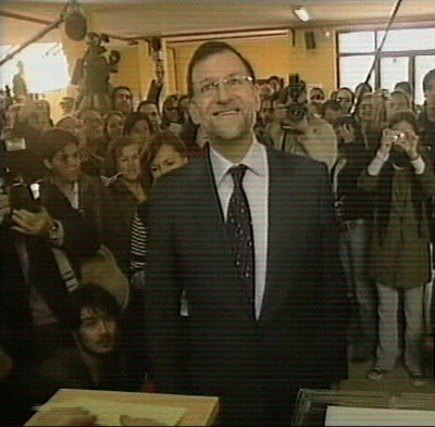 El presidente del PP y candidato popular a la Presidencia del Gobierno, Mariano Rajoy (c), acudió a votar al Colegio Santa Bernardette de la localidad madrileña de Aravaca. (LD)