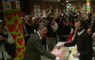 El alcalde de Madrid, Alberto Ruiz Gallardón, votó en el instituto de Enseñanza Secundaria San Mateo (Madrid), acompañado por su esposa y sus hijos. Tras votar, recordó que es "la mejor respuesta" en democracia a la barbarie del terror. (LD)