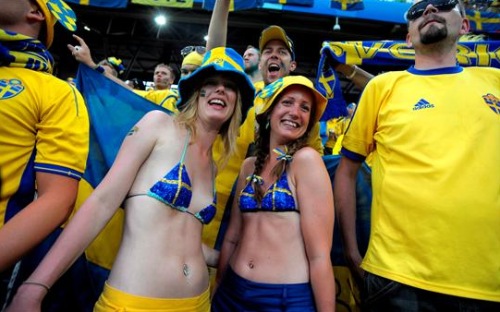 Aficionadas suecas animan a su selección ante Grecia durante el partido disputado en el estadio Wals-Siezenheim de Salzburgo. (EFE)