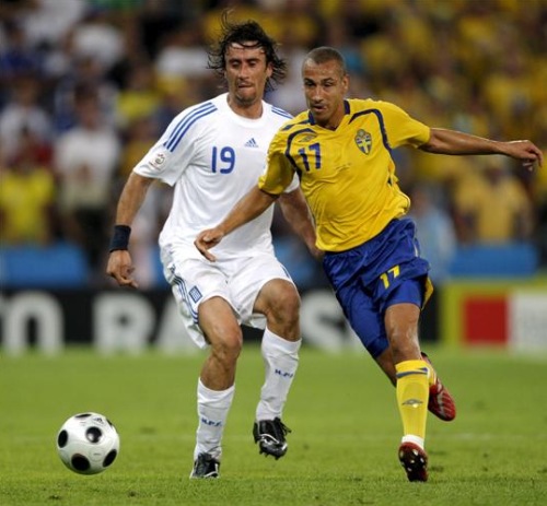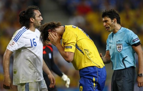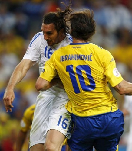 El griego Sotiris Kyrgiakos (i) colisiona con el sueco Zlatan Ibrahimovic. (EFE)