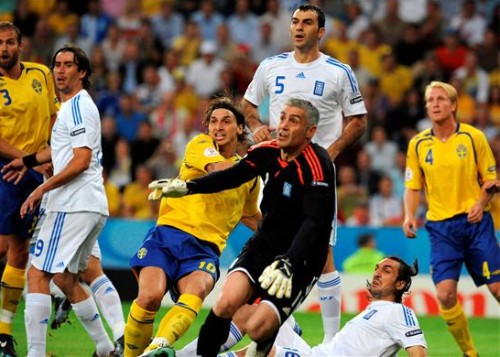 El portero Nikopolidis trata de atrapar el balón ante la presencia de Ibrahimovic. (EFE)