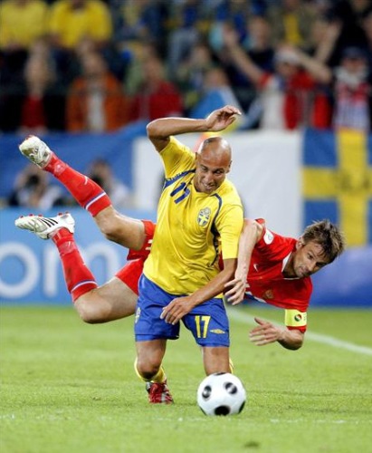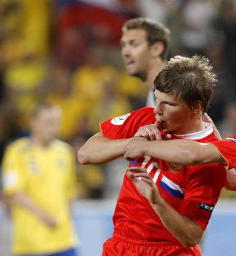 El ruso Andrei Arshavin (d) marcó el segundo gol de su equipo en la victoria contra Suecia (2-0) en el estadio Tivoli Neu de Innsbruck, en la última jornada del grupo D de la Eurocopa. Rusia pasa a cuartos de final y se medirá el sábado a Holanda. (EFE)