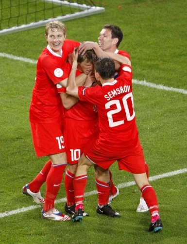 Andrei Arshavin (c) celebra el 2-0 junto a sus compañeros Roman Pavlyuchenko, Konstantin Ziryanov e Igor Semshov (de izquierda a derecha). (EFE)