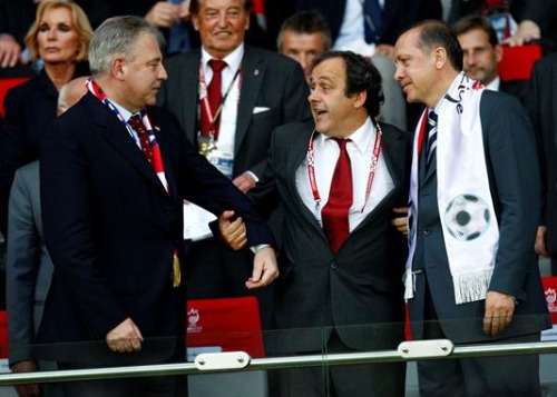 El presidente de la UEFA, Michel Platini, (c), conversa con el primer ministro croata, Ivo Sanader (i), y el primer ministro turco, Tayyip Erdongan (d), antes del comienzo del partido. (EFE)