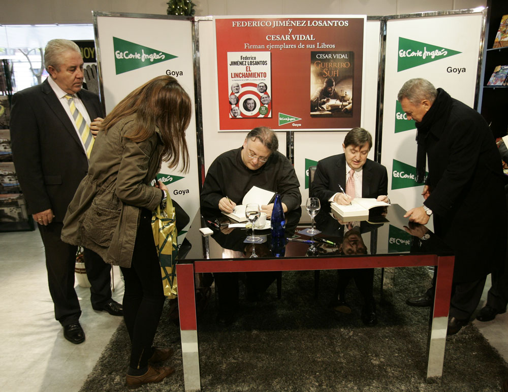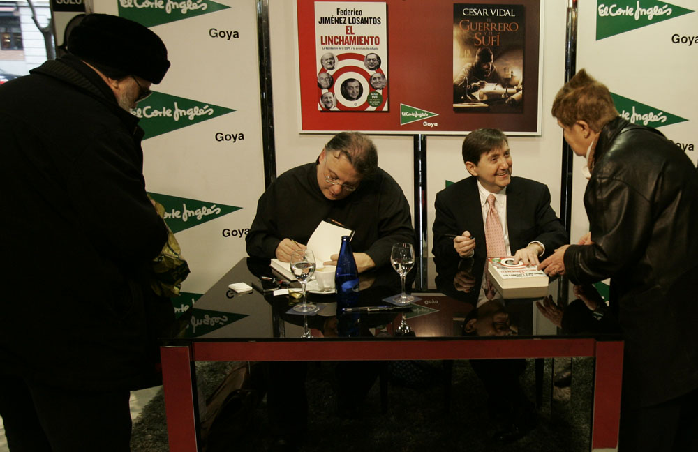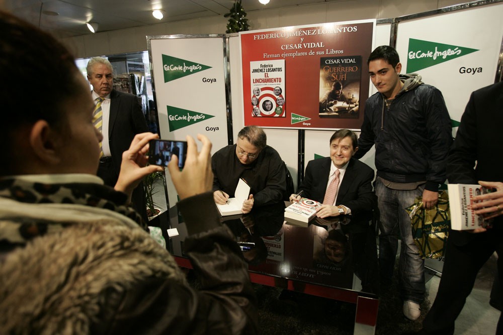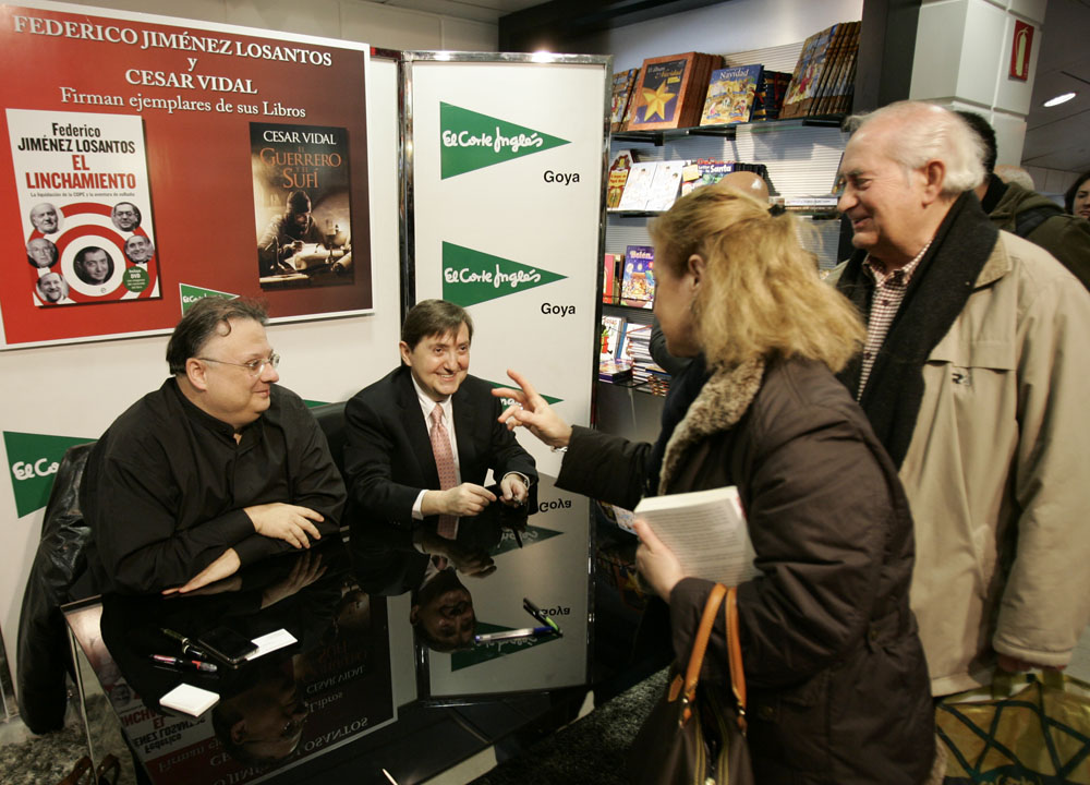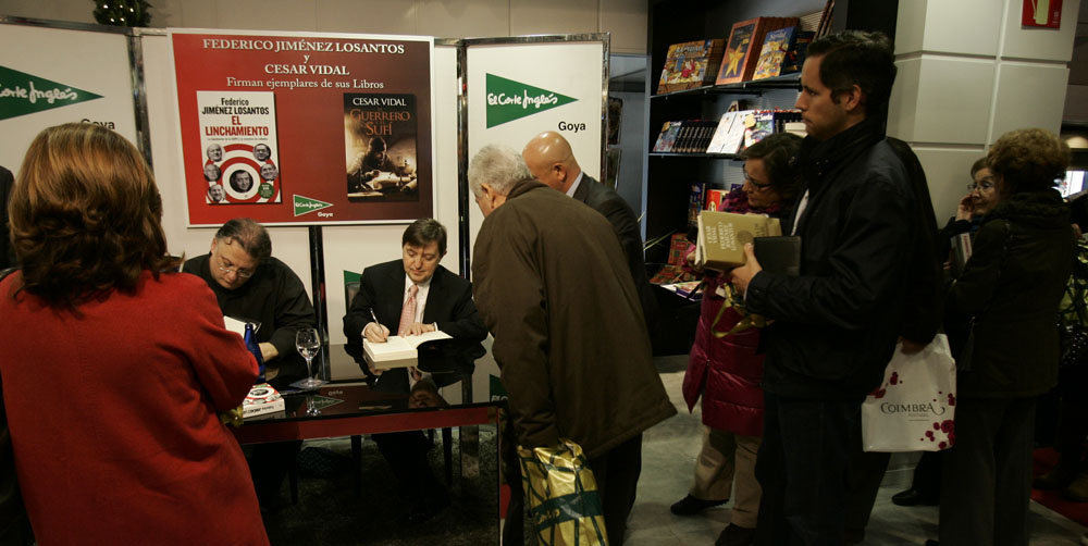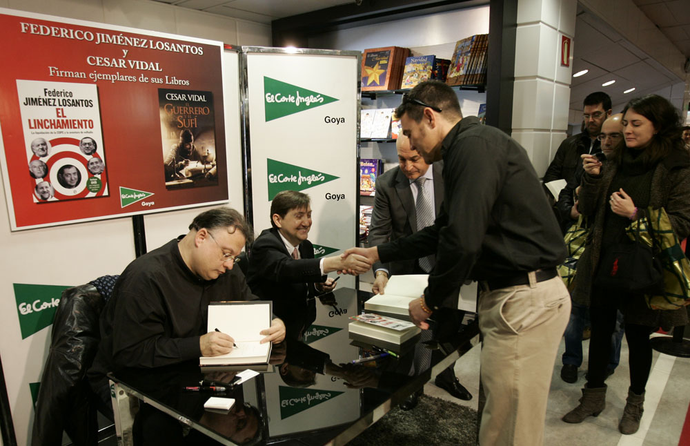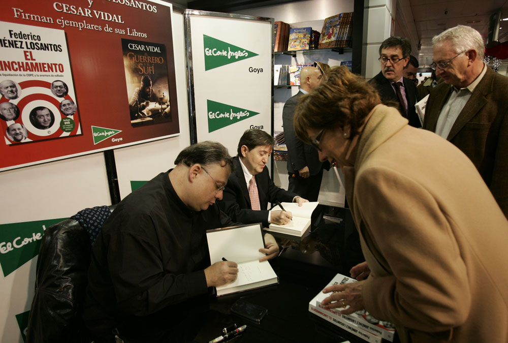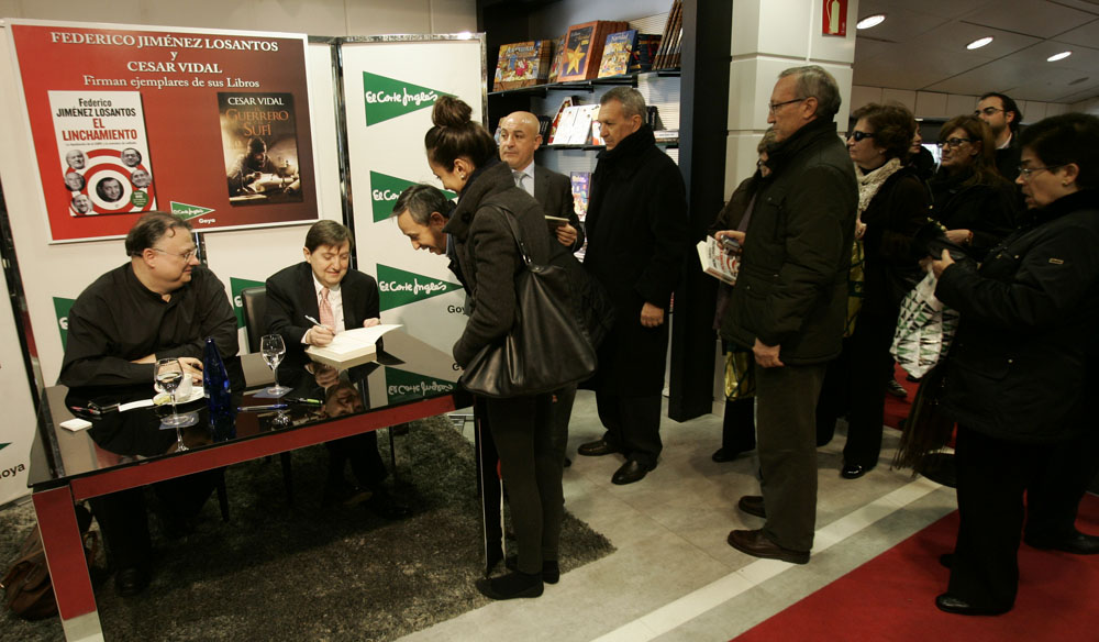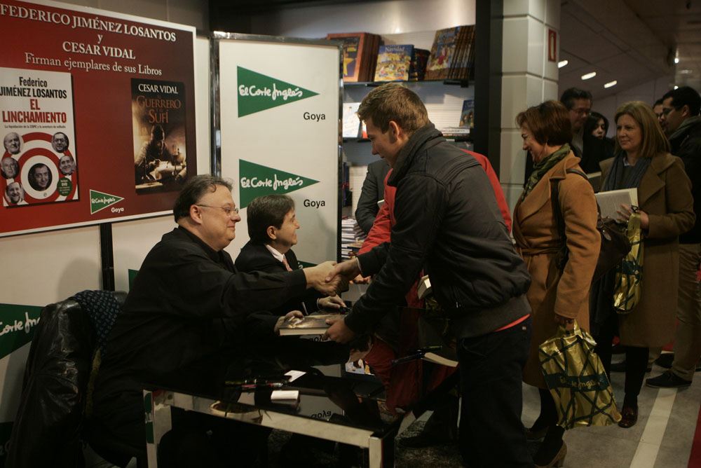 Minutos antes de que comenzara la firma de libros de Federico Jiménez Losantos y César Vidal en El Corte Inglés de Goya este sábado, la puerta del centro comercial estaba llena de gente. Provistos con los nuevo libro de Federico Jiménez Losantos (El Linchamiento -La Esfera de los Libros- )y de César Vidal (El guerrero y el sufí -Grijalbo-), esperaban pacientes a que comenzara la firma de libros.