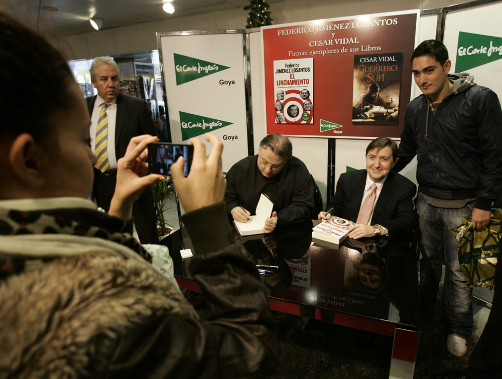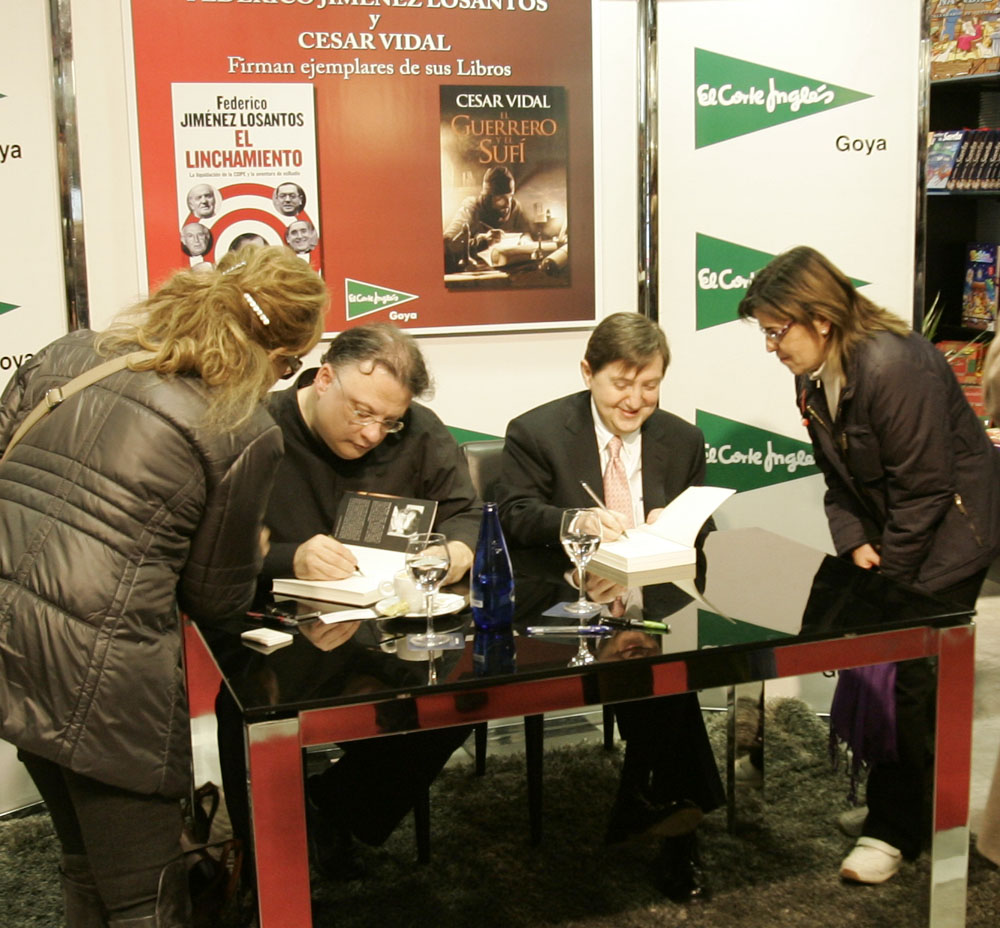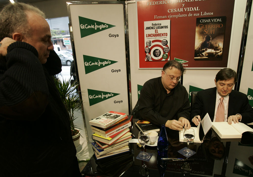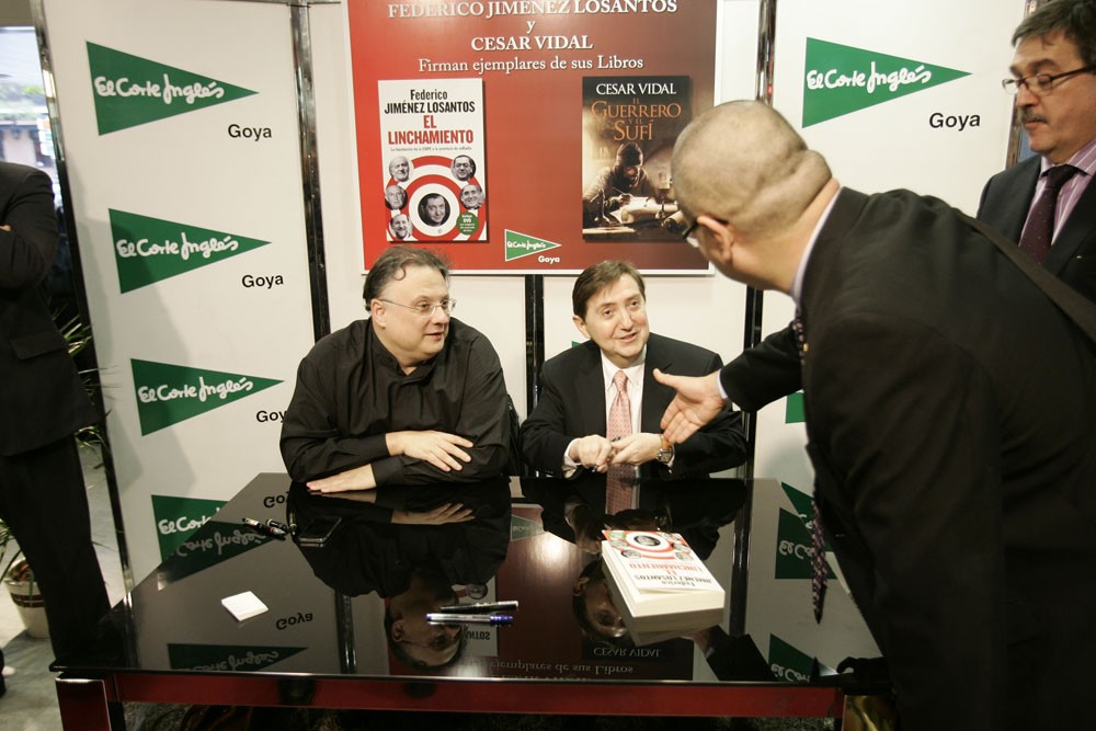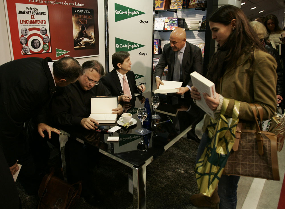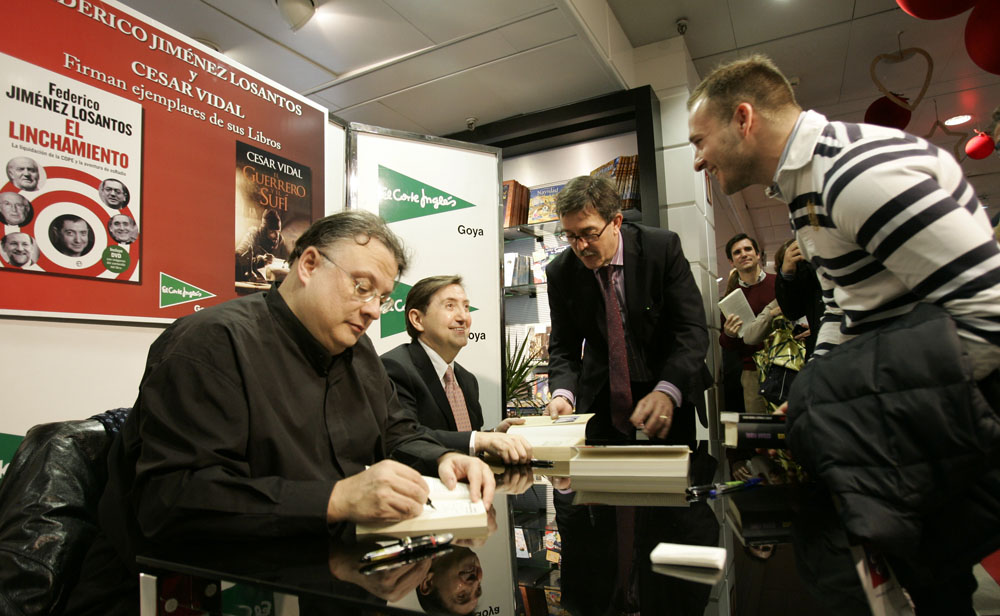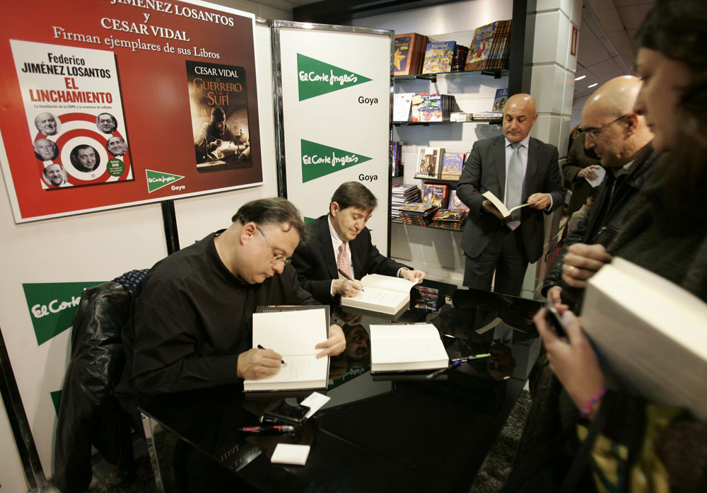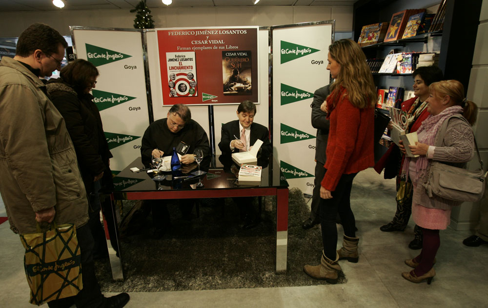 Minutos antes de que comenzara la firma de libros de Federico Jiménez Losantos y César Vidal en El Corte Inglés de Goya este sábado, la puerta del centro comercial estaba llena de gente. Provistos con los nuevo libro de Federico Jiménez Losantos (El Linchamiento -La Esfera de los Libros- )y de César Vidal (El guerrero y el sufí -Grijalbo-), esperaban pacientes a que comenzara la firma de libros.