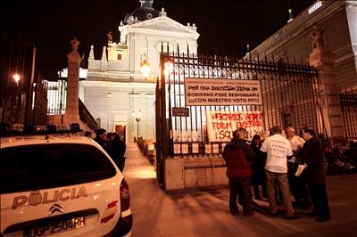Tras la lectura del manifiesto, algunos de los congregados se dirigieron hasta La Almudena para testimoniar su apoyo a la veintena de afectados que permanecieron desde la tarde de ayer y durante toda la noche encerrados en la catedral. (EFE)