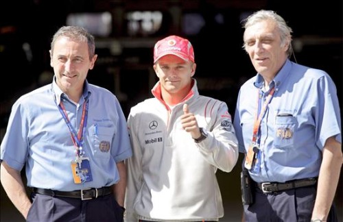 El doctor francés de la FIA French Jacques Tropenal (izqa) el piloto de McLaren Mercedes el finlandés Heikki Kovalainen (c) y el doctor de la FIA Jean Charles Piette (dcha) posan para los medios tras un chequeo médico a Kovalainen en el circuito de Estambul de Turquía, hoy, jueves 08 de mayo. El Gran premio de Turquía de Fórmula Uno tendrá lugar en el circuito Parque Estambul el próximo 11 de mayo. EFE