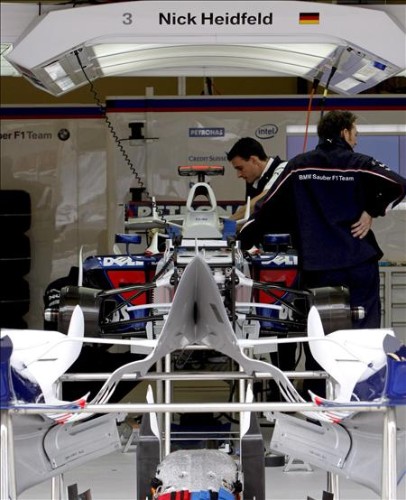 Los ingenieros del coche Nick Heidfeld de BMW trabajan en uno de los garajes del circuito de Estambul de Turquía, hoy, jueves 08 de mayo. El Gran premio de Turquía de Fórmula Uno tendrá lugar en el circuito Parque Estambul el próximo 11 de mayo. EFE