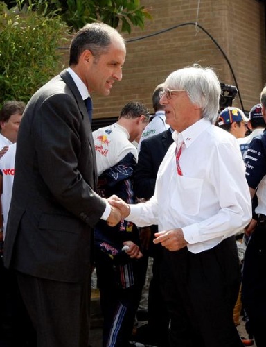 El presidente de la Generalidad Valenciana, Francisco Camps (i), y el patrón de la Fórmula Uno, Bernie Ecclestone, se saludan tras los cinco minutos de silencio que se han guardado en memoria de los fallecidos en el accidente aéreo ocurrido el miércoles en Barajas, en el primer día de entrenamientos libres en el circuito urbano de Valencia, donde se va a celebrar este fin de semana el Gran Premio de Europa de Fórmula Uno. (EFE)