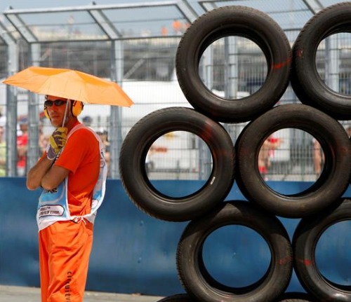 Uno de los comisarios de carrera se protege del sol durante la sesión vespertina de entrenamientos en el circuito urbano de Valencia. (EFE)