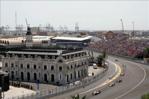 Varios pilotos a su paso por una de las curvas del circuito urbano de Valencia. (EFE)