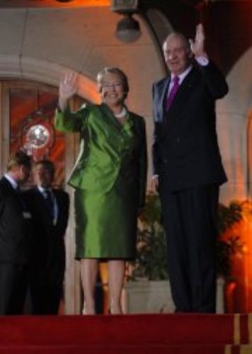 El rey de España Juan Carlos conversa con la presidenta de Chile, Michelle Bachelet, este sábado durante la foto oficial de los mandatarios de los países participantes. (EFE)