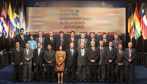Los cancilleres de los países participantes de la XVII Cumbre Iberoamericana de Jefes de Estado y de Gobierno posan este jueves para la foto oficial de familia, en Santiago de Chile. (EFE)