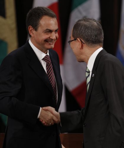 El presidente del Gobierno español, José Luis Rodríguez Zapatero, y el secretario general de la ONU, Ban Ki-moon, participaron en un acto en el edificio de la Comisión Económica para América Latina y el Caribe, en Santiago de Chile, en donde discutieron soluciones a la pobreza en Iberoamérica. (EFE)
