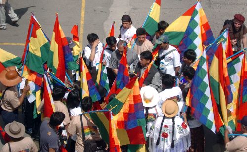Hombres y mujeres portan banderas que representan a los pueblos nativos de América, en la Cumbre de los Pueblos que se lleva a cabo de forma paralela y simultánea a la Cumbre Iberoamericana de Jefes de Estado y de Gobierno, en Santiago de Chile. (EFE)