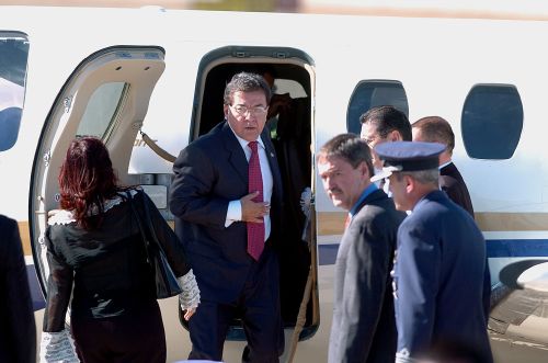 El jefe de estado argentino, Néstor Kirchner, y su esposa, Cristina Fernández, a su llegada a Santiago de Chile para participar en la XVII Cumbre Iberoamericana. (EFE)