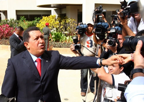 El presidente venezolano Hugo Chávez saluda a los periodistas. Chávez cumplió el anuncio que hizo el viernes en Caracas cuando confirmó que participaría en la Cumbre Iberoamericana: "viajaré esta noche para amanecer en Santiago de Chile", dijo. (EFE)