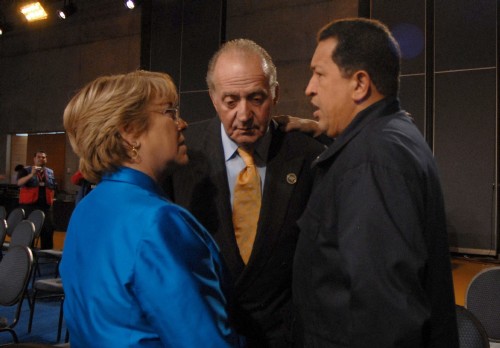 La presidenta chilena, Michelle Bachelet, conversa con su homólogo venezolano, Hugo Chávez, ante el Rey Juan Carlos, en la última sesión de trabajo de la XVII Cumbre Iberoamericana. (EFE)