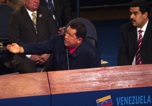 El presidente de Venezuela, Hugo Chávez, acompañado por el canciller Nicolás Maduro, responde al jefe de Gobierno de España, José Luis Rodríguez Zapatero, y al Rey Juan Carlos, en el Plenario de la Cumbre. (EFE)