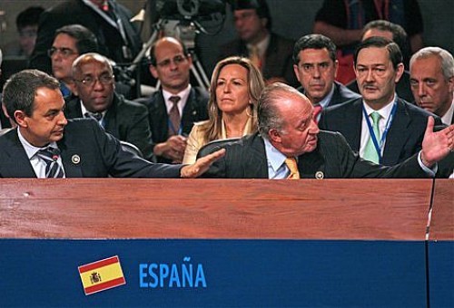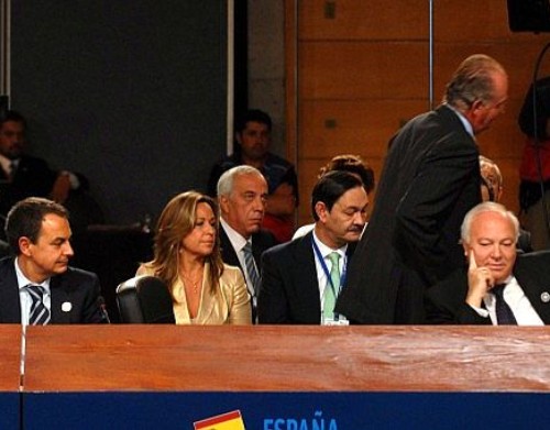 El rey de España Juan Carlos I abandonó el plenario de la Cumbre Iberoamericana mientras el presidente nicaragüense, Daniel Ortega, criticaba a empresas españolas, momentos después de que Chávez profiriera insultos contra el ex presidente del gobierno de España José María Aznar. (EFE)