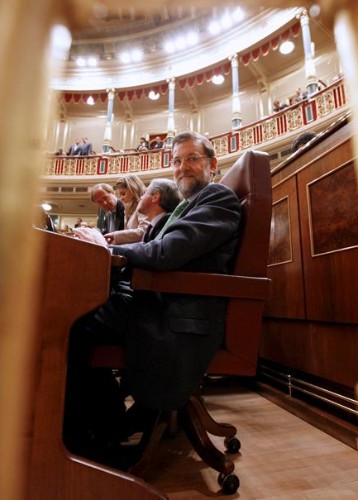 El presidente del PP, Mariano Rajoy, es observado por los diputados del PP durante una de sus inervenciones en la sesión de investidura.