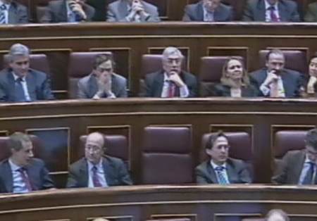 Algunos diputados populares presentes en el Hemiciclo escuchan la intervención de Rodríguez Zapatero mientras esperan el turno de Mariano Rajoy.