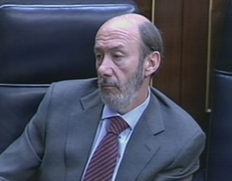 El ministro del Interior en funciones, Alfredo Pérez Rubalcaba, escucha atentamente a su jefe de filas durante su alocución en la que también ha hablado sobre terrorismo.